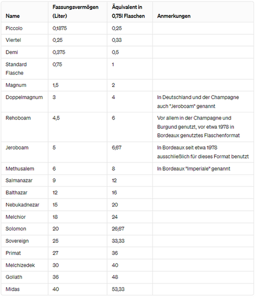 The names of the special formats of wine bottles originate from biblical and historical traditions as well as from the French wine tradition. The designations often have religious or historical significance. For example, the name "Jeroboam" refers to a biblical king, while "Methuselah" alludes to one of the biblical figures with a very long life. "Balthazar" and "Nebuchadnezzar" are names of ancient rulers. These names give the special formats a particular symbolism and make them coveted collector's items and prestige objects in the world of wine.